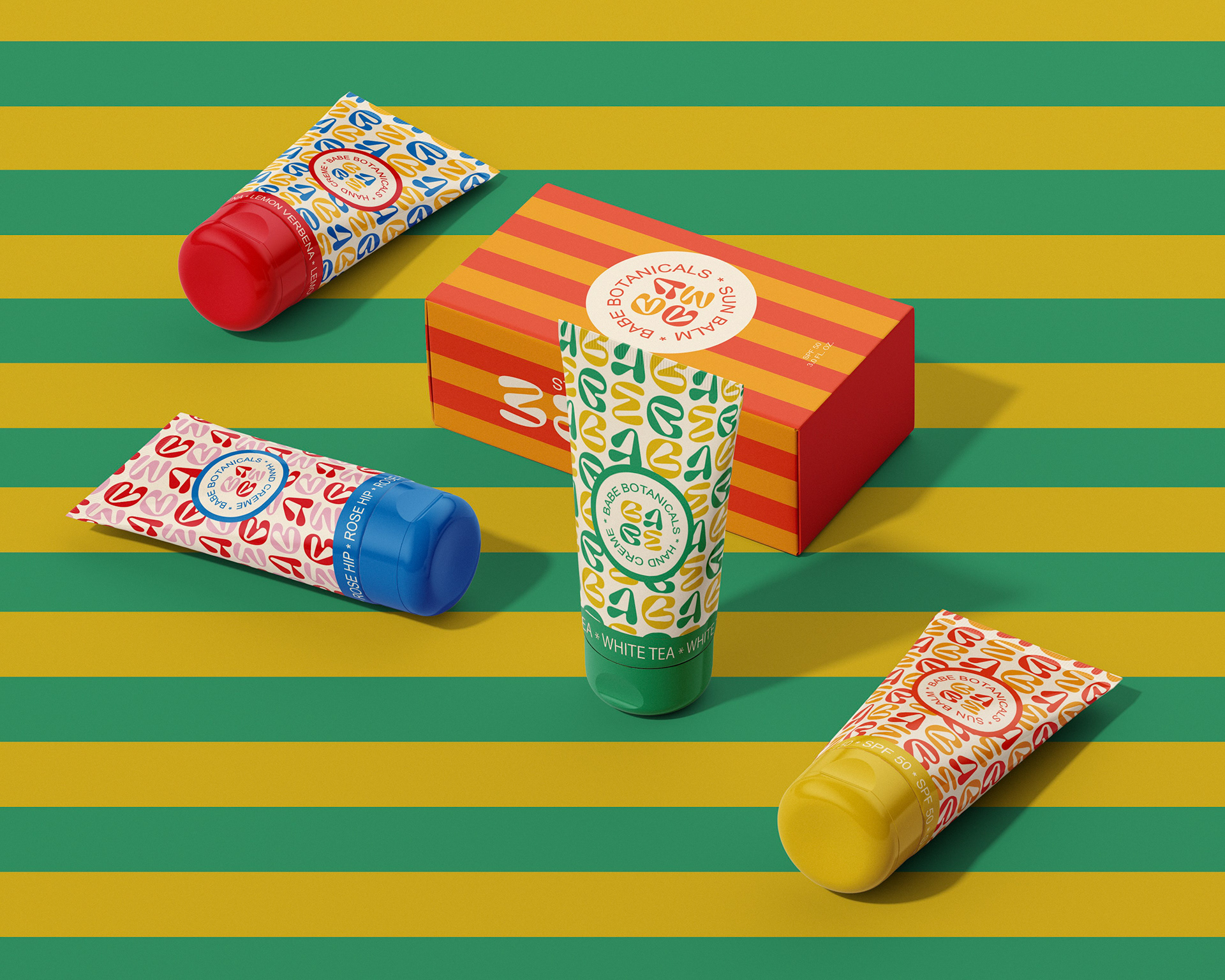 Babe Botanicals is a theoretical skincare brand designed to feel colorful, playful, and rejuvenating. The brand uses an organic-looking typeface as a central visual element, while the whimsical color palette and design convey energy and freshness. This project focused on packaging design for products including sunscreen, hand cream, and lip balm, exploring how cohesive design can communicate brand personality and elevate everyday products. Through this work, I examined how type, color, and packaging can combine to create a visually engaging, approachable, and memorable skincare experience.