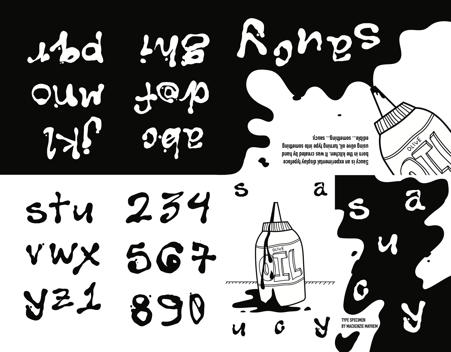 Saucy is a typeface inspired by a moment in the kitchen. While working as a cook, I would always garnish our gazpacho with olive oil. One day I came to the realization that the viscosity of the gazpacho held the shape of the olive oil. This observation led me to experiment with creating letterforms out of olive oil. The result is Saucy, a typeface that blurs the line between food and graphic design. This project explores the intersection of culinary practice, material experimentation, and type design, turning a simple culinary observation into a unique visual language.
